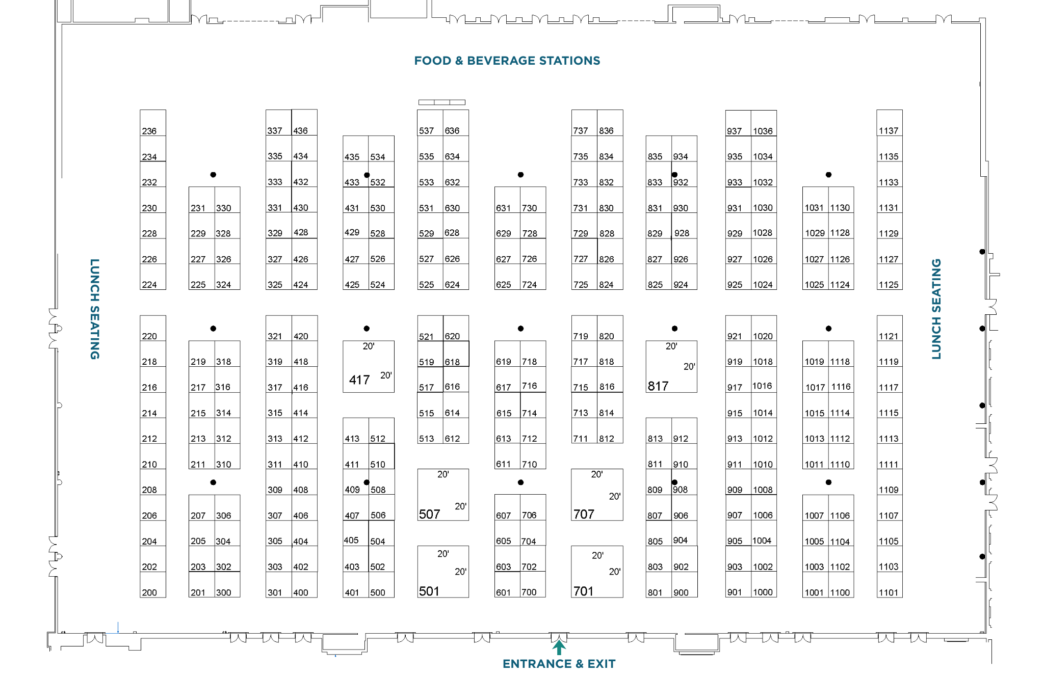 The floor plan allows for 264 10’ x 10’ booth spaces (which may be combined to accommodate 10’ x 20’ booths) and six 20’ x 20’ island booths. Island booths available until supplies last - additional Island booths will not be added to the floor plan. All 20’ X 20’ island booths are exclusive to supporters of the conference at the Platinum ($10,000 spend, not including booth fee) sponsorship level.